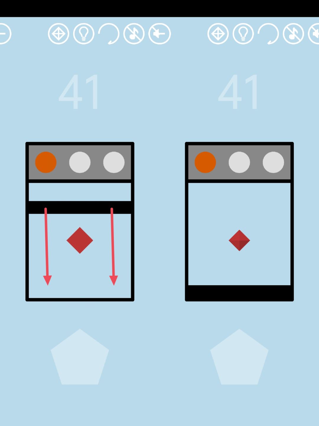 第41关:这一关的目标是制造一个和下方白色轮廓形状、大小一致的黑色图案。一共有三个按钮。左起第一个按钮控制大小,开启此按钮,将图案放在方框内,黑长条从上到下是缩小一号,从下到上是增大一号,一共有15个大小型号。第二个按钮控制形状,开启此按钮,将图案放在方框内,拉动黑长条,可使图案在圆形、三角形、菱形、五边形、六边形之间转换。第三个按钮控制颜色,开启此按钮,将图案放在方框内,拉动黑长条,可使图案的颜色在绿、蓝、紫、黑、红、橙之间转换。这关每次的初始图案和目标图案都不一样,因此没有一个通用的步骤。