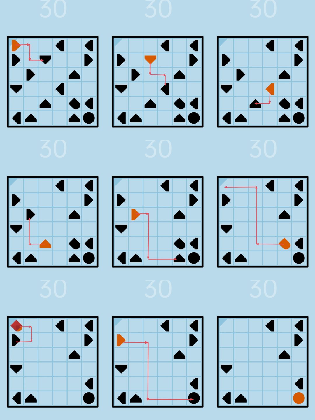 第30关:玩家控制的图形是橙色。当橙色图形的尖端指着相邻格子里的另一个图形的时候,原来的橙色图形消失,被指的图形变成橙色,继承玩家的控制权。下图所示的图形(蘑菇形)拥有向上和向左的两个尖端。