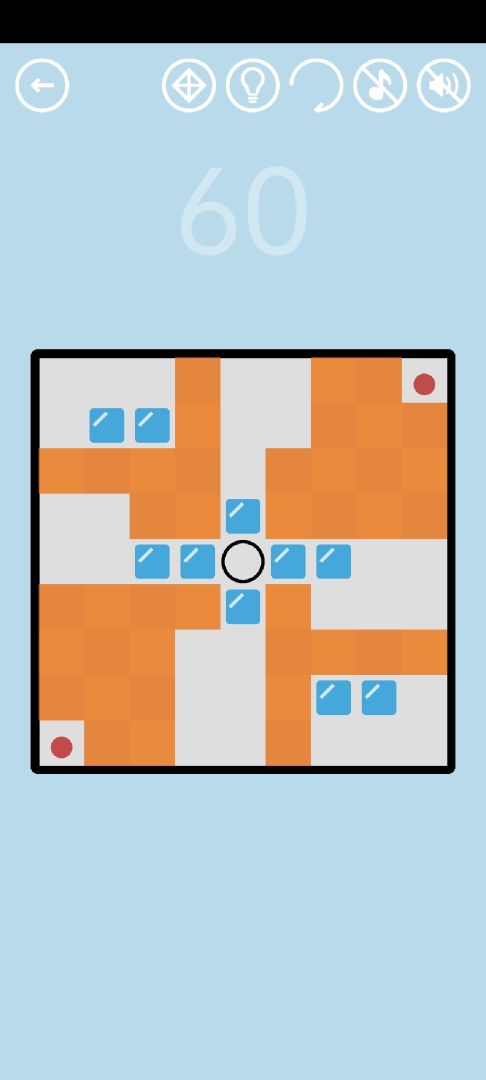 第60关:这关有一定难度。滑动控制小球移动,小球可以推动冰块,而且可以同时推好几个;一个冰块可以破坏一个橙色方块。收集左下和右上的两个红色小球得到通关按钮。通关按钮出现后,中央的格子会变成淡红色,将一个冰块推到淡红色格子上得到红宝石。这关与前面关卡的不同之处在于,通关难度与是否想收集红宝石有关。如果要宝石,前面就必须省下一个冰块,也就是说难度会变大。一种获得红宝石的方法如视频所示: