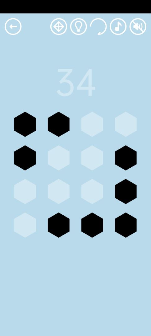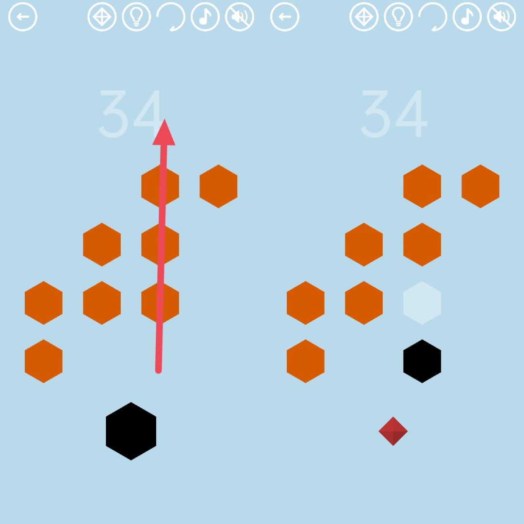第34关:左右滑动可移动一整行,上下滑动可移动一整列(横行纵列)。把所有六边形都移动到白色轮廓上,通关按钮就会出现。一种通关方法为:第二列上滑两次、第三列上滑、第四列上滑、第一行左滑、第二行右滑、第三行左滑、第一列下滑,共八步。视频如下: