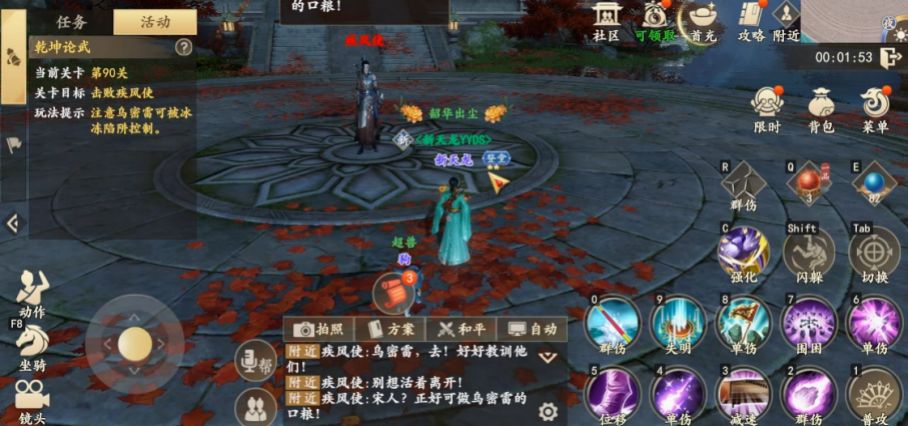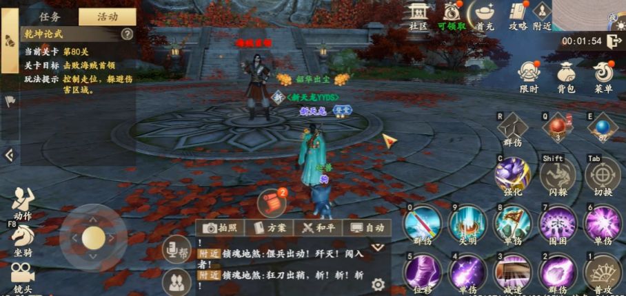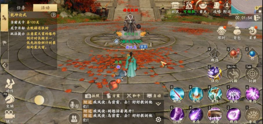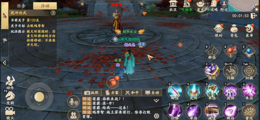 (2)注意脚下出现紫色漩涡时,角色将会朝着移动摇杆操作的反方向移动,注意此时需反向操作摇杆使角色向预期方向移动。(3)BOSS召唤追魂毒蝎后,注意切换目标,快速消灭毒蝎,阻止他们触碰丁春秋。