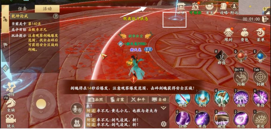 (2)BOSS召唤剑魄时,注意通过观察剑魄爆发范围,找出击碎后有安全区域的剑魄。多个爆发区域相互叠加,红色预警颜色会更深,找出场上红色预警叠加颜色最淡的位置即为潜在的安全区域,击碎距其最近的剑魄即可。注意当BOSS召唤4个剑魄时,其中只有1个剑魄被击碎后存在安全区域。