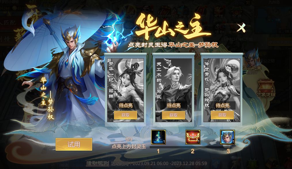 集齐三个封灵玉即可获得华山之主·梦·孙权。所有的仙术师都可以在华山之主页面免费领取道具封灵玉*华山之主(1天),活动期间仅可领取一次~
