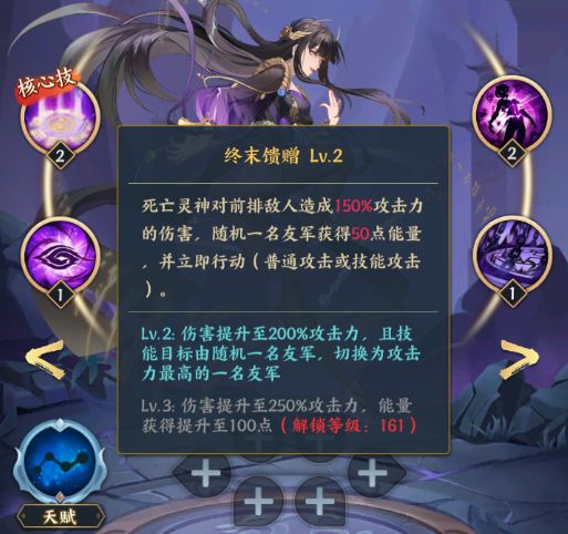 两大核心技能,二级大招让攻击最高的友军获得50能量且再次行动,三级大招让攻击最高的友军获得100能量且再次行动。