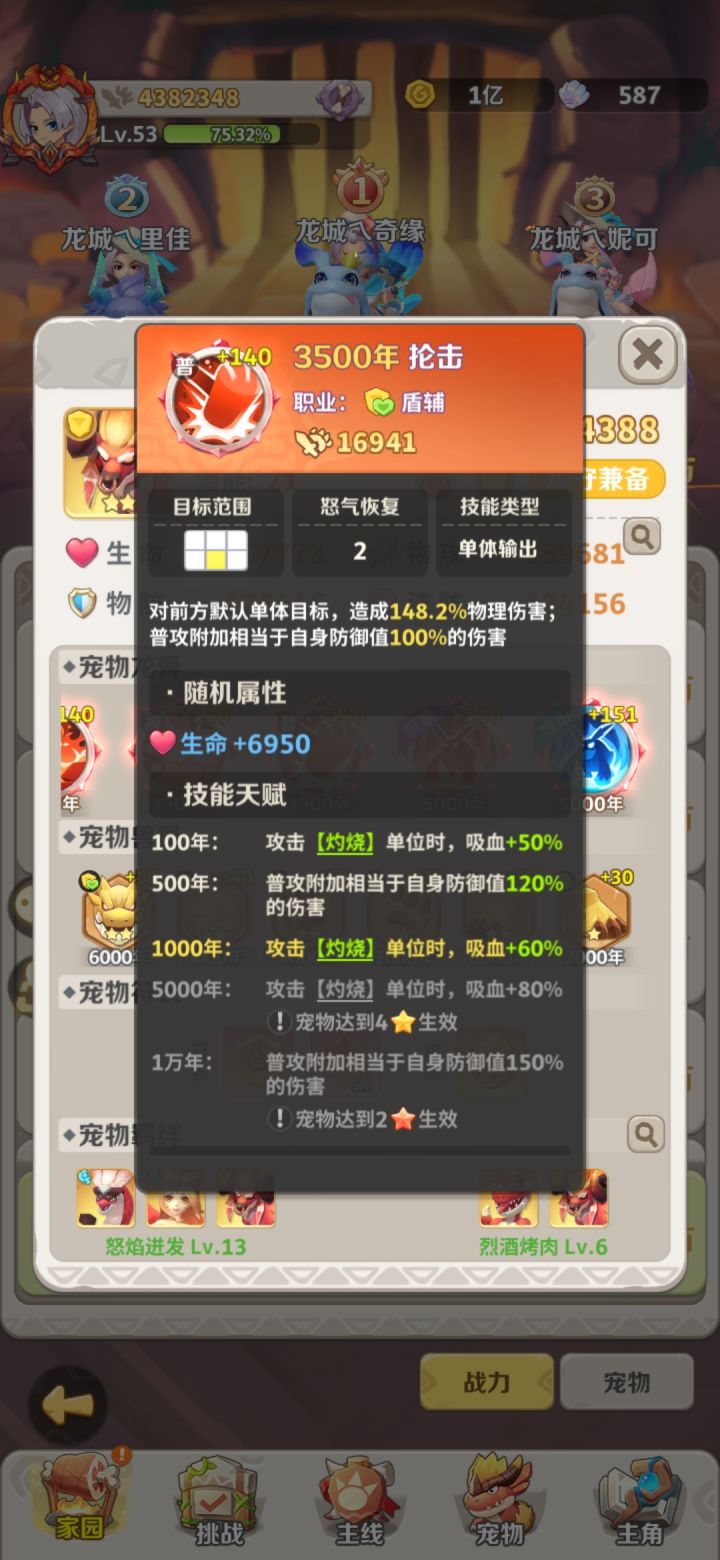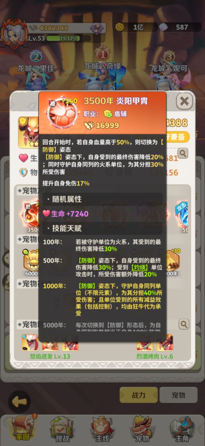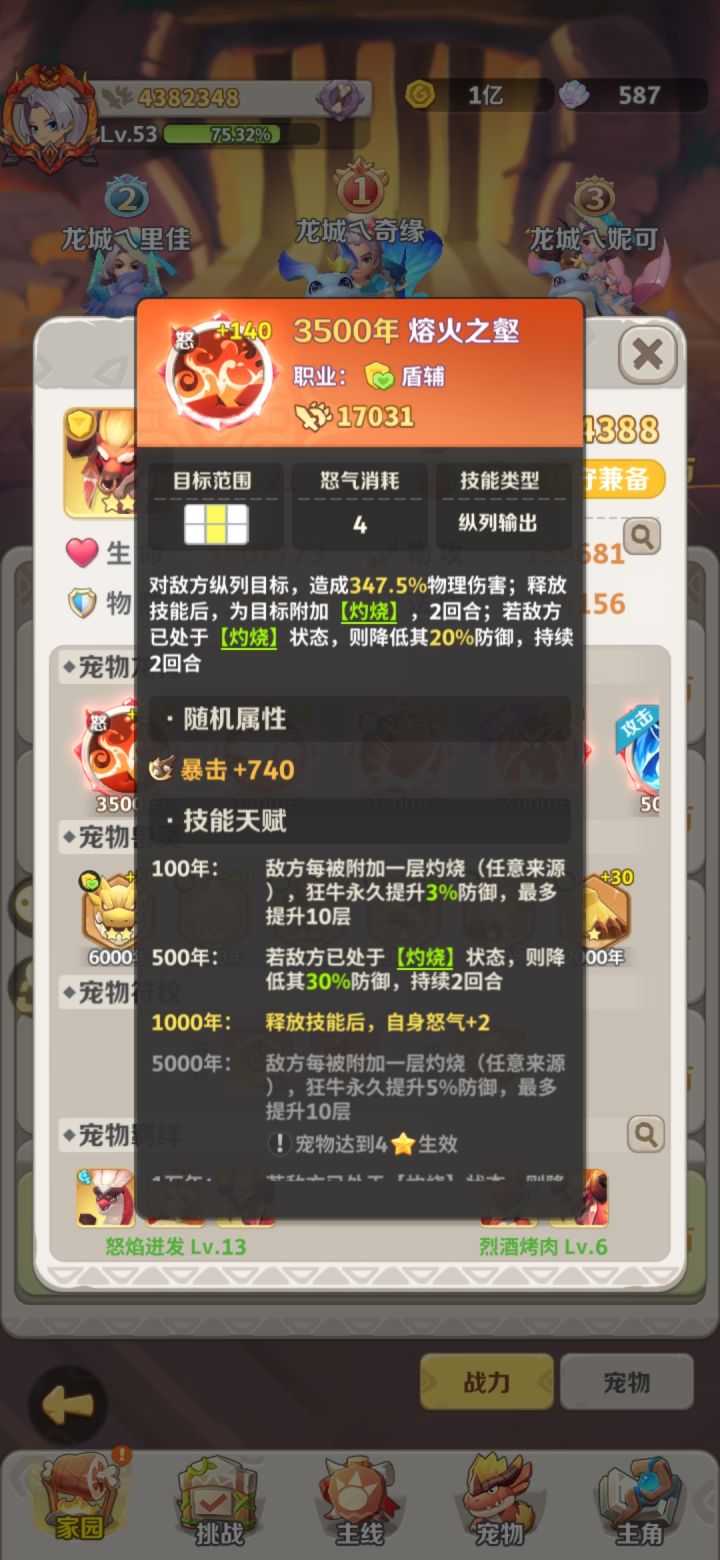 关于二创我的实际感觉是他的定位我觉得不对,首先作为首个(目前我能看到图鉴)有两种形态的宠物,定位是辅助的话,他的防御状态是加防御数值,伤害也是有防御加成,游戏对于防御这个属性认知还是差一些的(我做为菜鸟反正是不太行),如果能换成最大生命值,或者把土系裂甲改成降低防御强化防御值这个概念就好了,反正我玩了一个月没觉得双防多重要,反正都是被爪龙秒,不过有个这个承担伤害的牛哥,对我来说最起码对位的话是不容易被秒了对于二创,我的感觉是如果单纯让他来保护C有点太鸡肋了,毕竟越往后除非战力太大我觉得想秒还是难的,如果能把他的技能包括防御的数值换成最大生命值,把纵向变成单体,吸血变成回复友军,那我觉得这个辅助效果就出来了,能抗有回复就好了,双形态的,就别来回转换了,低于30或者20免疫一次控制,让他变成战士技能从单体变成一列,变成个副C,我觉得就很厉害了,而且也符合他的名字怒焰狂牛
