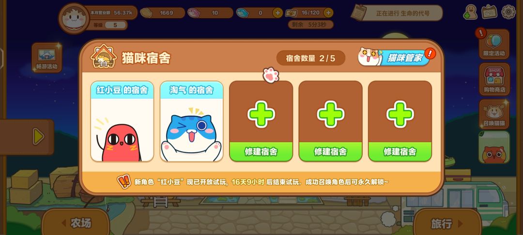 ⑧猫咪宿舍:开一两个就行~晚一点开,抽到稀有角色再入住,我放了个b级,不知道咋换出来上个别的