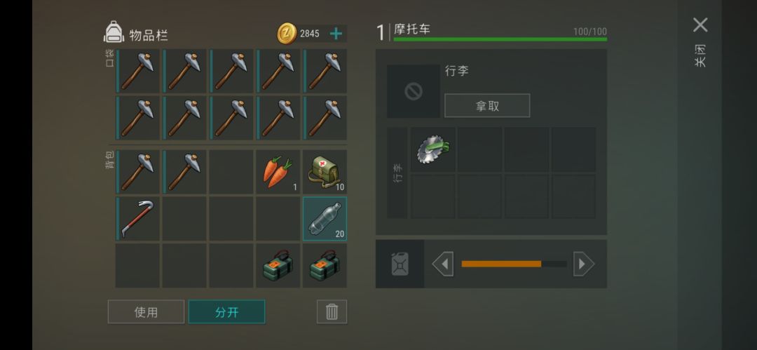 他家皮卡有一套军装,摩托车有油(可以装30小瓶)