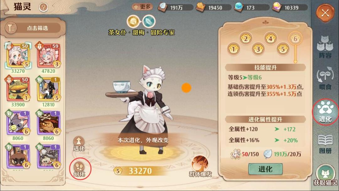 查看图片的标记点就可以选择幻化,不同品质的猫灵幻化的需求不一样可自行查看哦