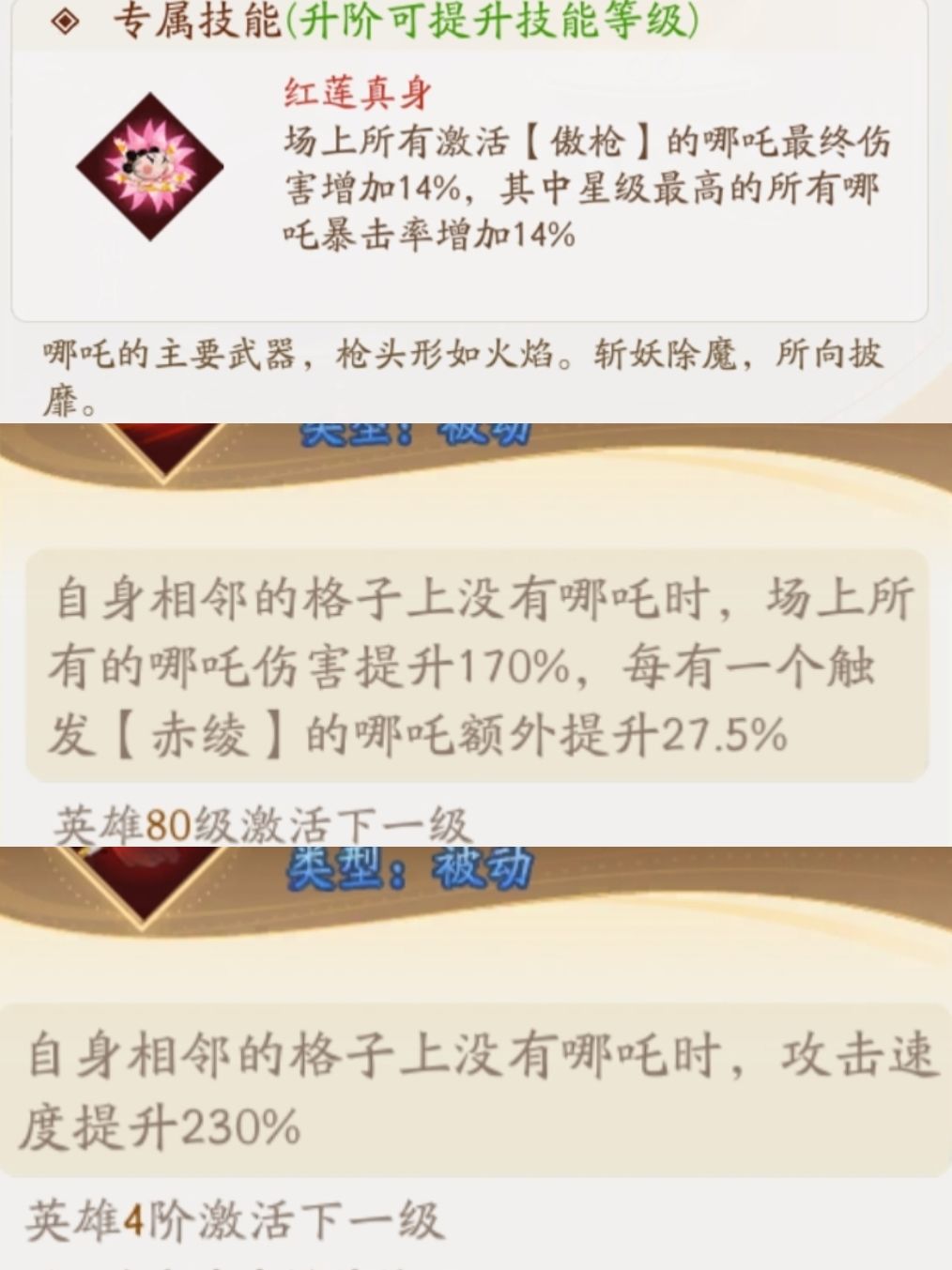 而哪吒更需要一些手法,可以靠土地的被动以及大招进行挪动位置来保证哪吒的输出,保证哪吒周围没有哪吒配上专武更佳~