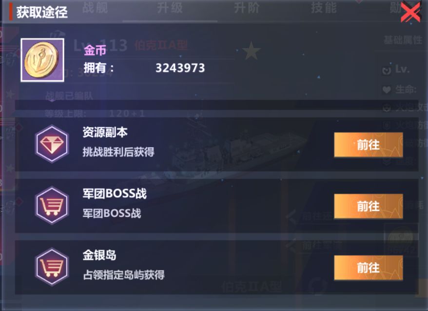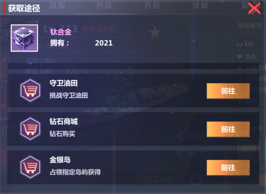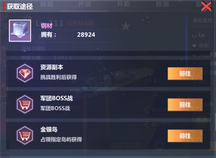 在战舰界面选中升级功能界面,当材料数不足时点击材料会弹出该材料的获取途径。