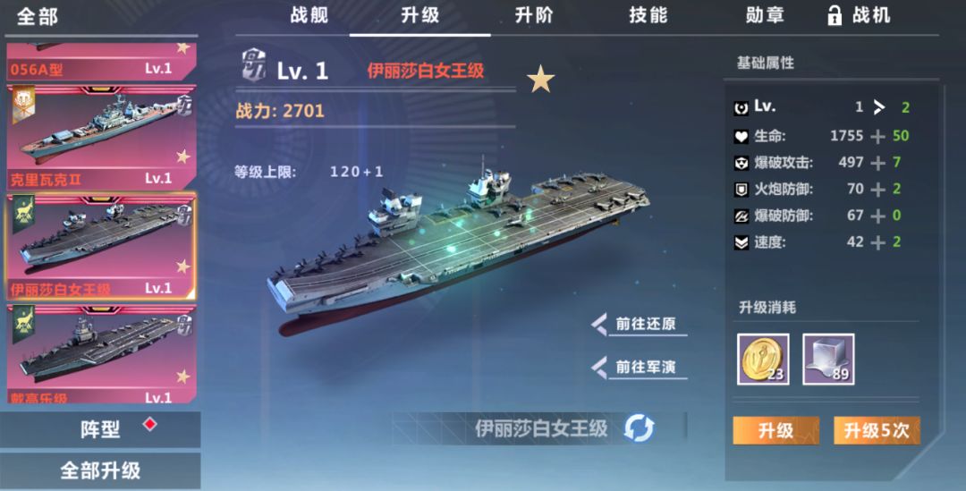点击下方舰队中任意战舰进入战舰属性界面点击升级按钮: