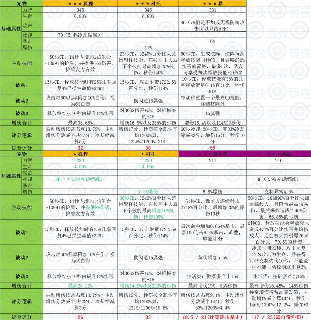 两只粉宠提升也很大,但是各自有各自的问题,总体都不如一星橙宠,猫头鹰需要打连击,蝙蝠需要吃灼伤异常,自带的异常不能保证全程是个问题,不过好在自带的技能伤害还算可以,打爆发也不错。大家按职业按需选择