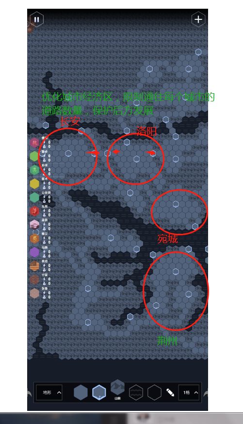 用山地包围城市经济区,同时根据三国志设置了重要关卡、港口,迂回的山路(子午谷、南阳地区),四战之地(寿春)等地形,河边设置部分山地,防止和AI对战,AI在岸边放置过多兵力。