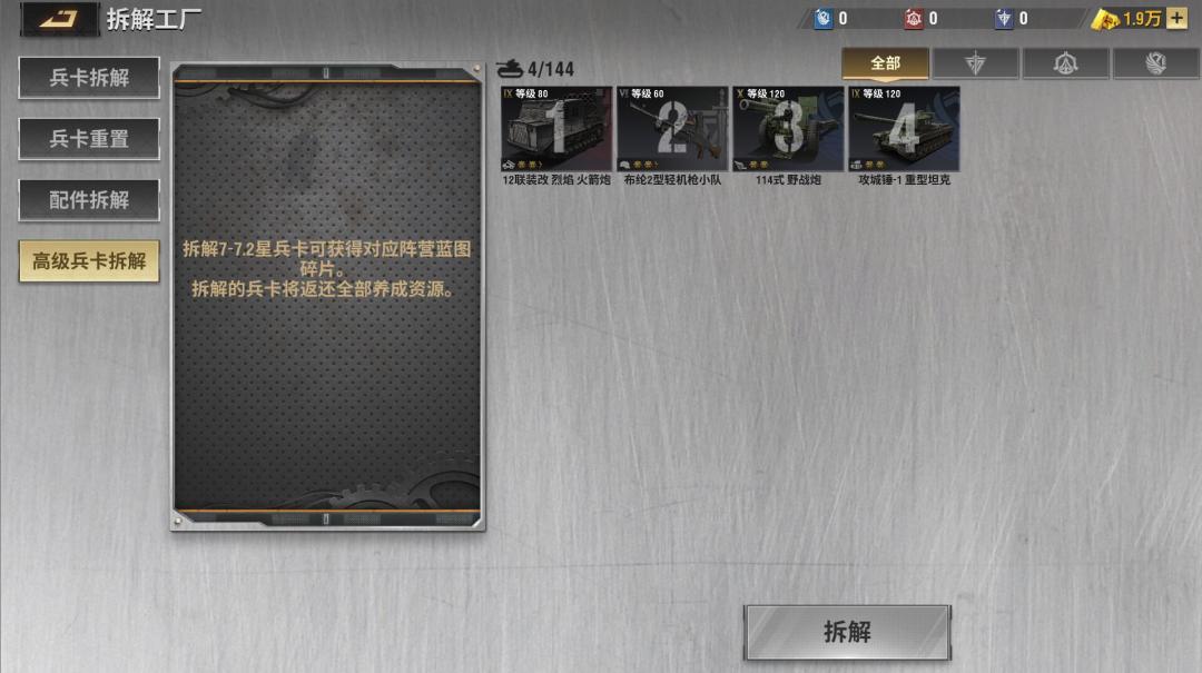如下图七星卡分解只能够获得同阵营的七星蓝图四张这里也特别强调了同阵营兵卡,也就是说你如果想玩赤熊阵营那你分解了其他阵营的兵卡再多,你赤熊阵营的兵卡也不可能能够用其他阵营的兵卡进行提升,你如果将星级分散开来养,正常来说你除非氪的多,不然不可能能够一群低星兵卡能打的过其他人的极限单兵卡大家目前知道了升星需要的蓝图量,那么分解所获得的蓝图量为7星是4张蓝图,7.1星为12张蓝图,7.2星为36张蓝图,也就是说想要分解到能升级到游戏顶星级9.2,那么就需要最少3个7.2星同阵营兵卡或9张7.1星同阵营兵卡或25张七星同阵营兵卡,然而这么多兵卡只够单个兵卡合成到9.2的量,一共有8个兵卡,五个陆军三个空军并且你前面的蓝图就算弄到其他阵营了,你的阵容里也会有其他阵营的兵卡迟早还能够使用,越往后你就越不能分散,比如我只玩了三个阵营的赤熊,如果全部到了9.2,那么再多的赤熊阵营的蓝图对我来说也没用了,也就是之后的蓝图只能用其他两个阵营,再或者是只剩下一个阵营后,如果你再出另外两个阵营的蓝图也就没有用了,所以当你剩下的阵营越少卡越少时,你想要不浪费的升到9.2星也就越难