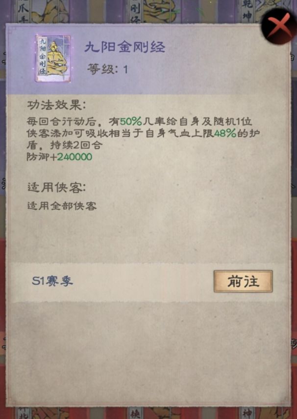 效果是:每回合行动后,有50%几率给自身及随机1位侠客添加可吸收相当于自身气血上限48%的护盾,持续2回合!