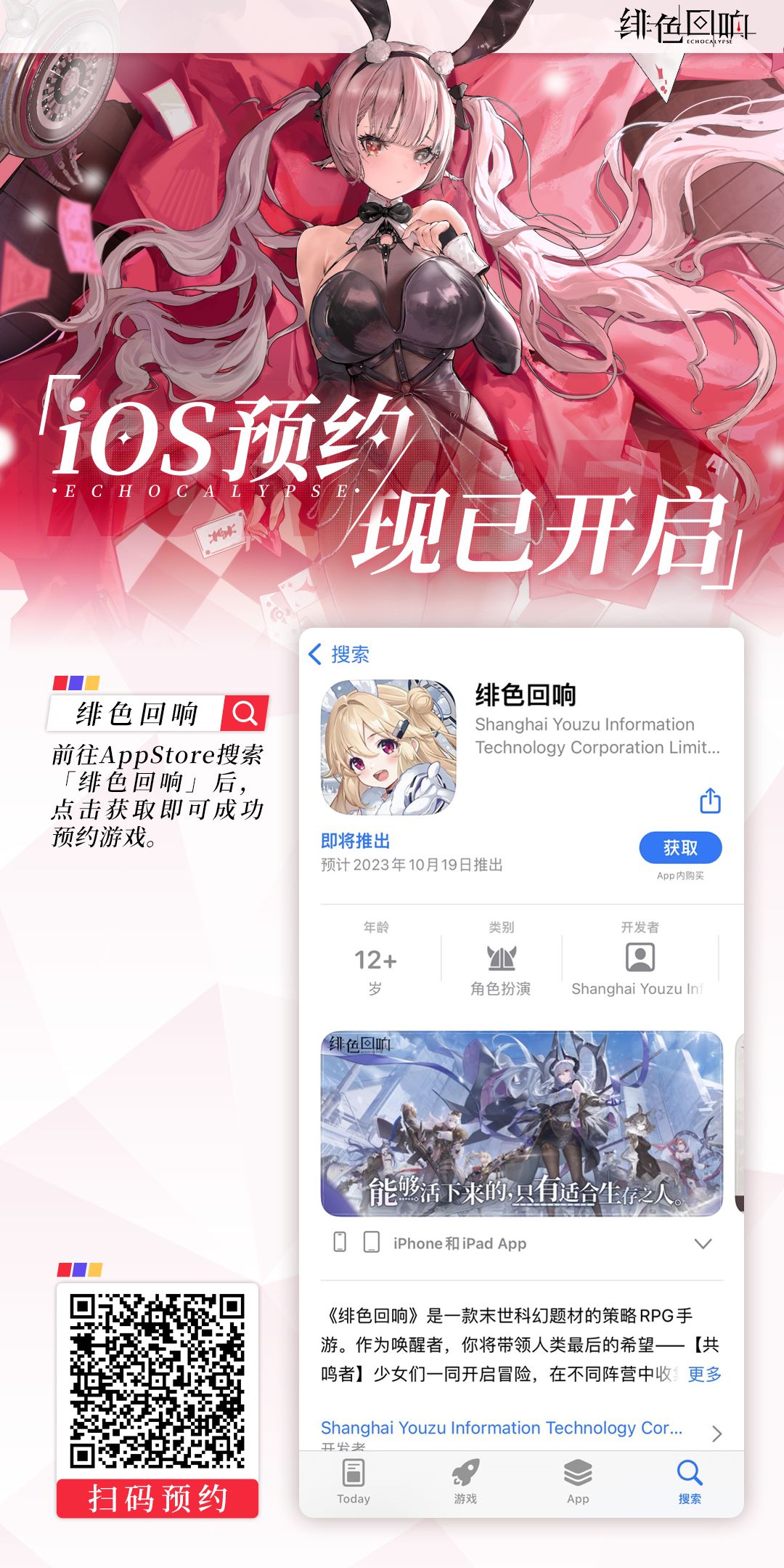 唤醒者们可前往App Store,搜索“绯色回响”,点击“获取”进行预约;预约完成后,即可在公测开启当日自动下载游戏!