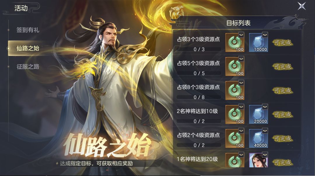 在快速完成第二章占领资源地和升级建筑的任务后,会获得玄玉和唤神符等奖励,最重要的是解锁了签到有礼、仙路之始、征服之路等福利活动。