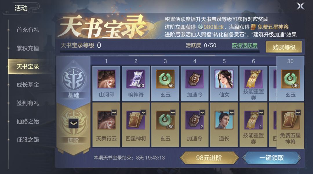 免费的基础版天书宝录满级可获得600玄玉;2000唤神符;四星技能山河印;四星素材;5张加速令;5张技能重置券;5张撤退令。