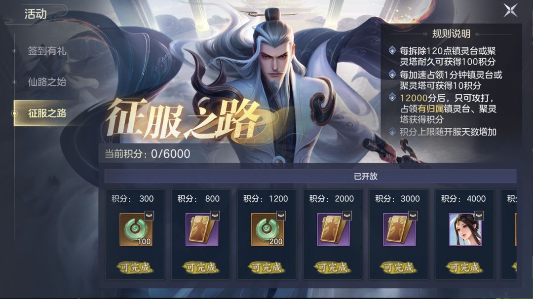 征服之路需要占领镇灵台或聚灵塔获取积分、解锁奖励。共计可获得1900玄玉、3张四星神将、1张五星素材,4张四星素材。占领时还可获得同盟贡献,在同盟商店兑换更多稀有奖励。