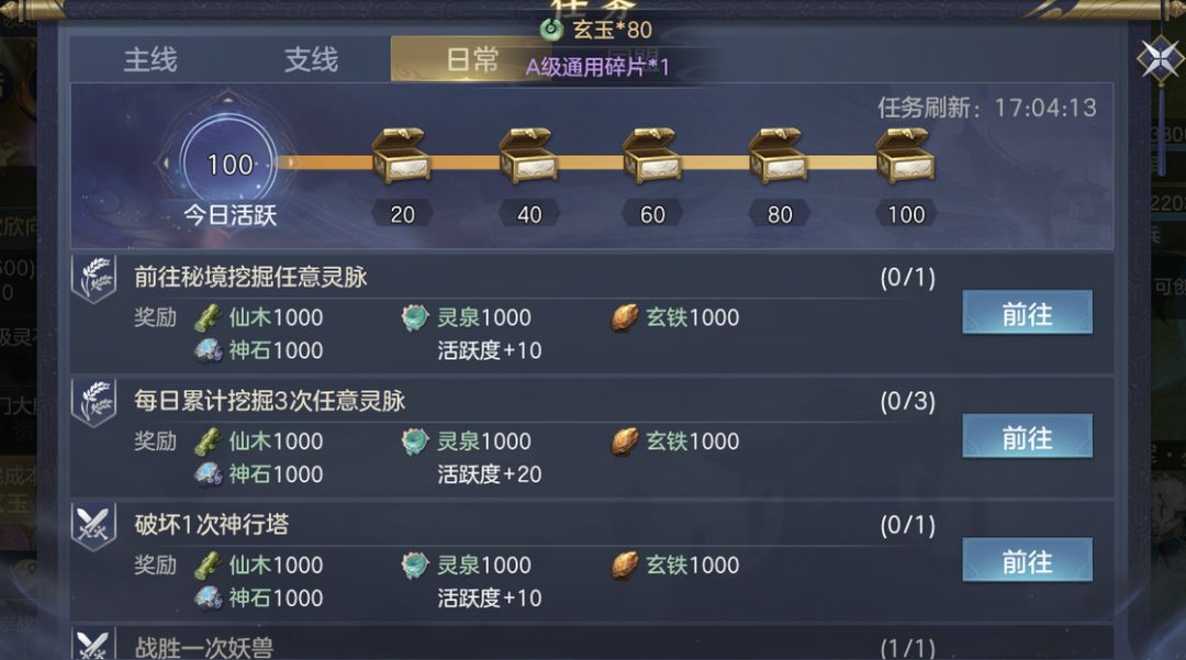 积累每日活跃度任务时,还可以领取80玄玉、A级技能碎片等道具。