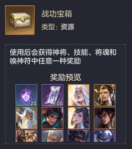 与敌对部队战斗可以获得战功,战功可在战功商店兑换战功宝箱和其他材料。战功宝箱有机会开出五星神将、五星技能等物品。