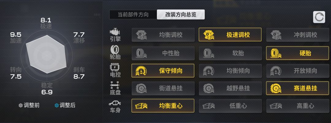 小极领略过SL 63 '22的风采后,试着改装了下,这样的方向比较适合小极的手感:引擎-极速调教、轮胎-硬胎、电控-保守倾向、底盘-赛道悬挂、车身-均衡重心设定。当然了,传奇车的培养成本比较高,所以在前期小极重点推荐针对引擎、电控、轮胎三个部位进行强化~