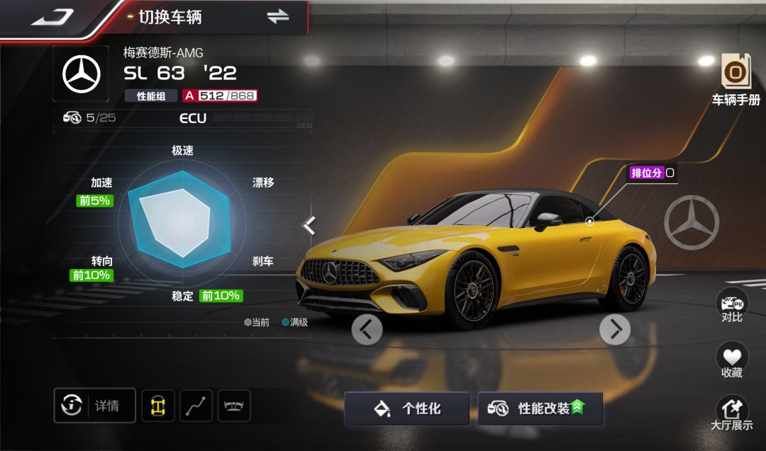 梅赛德斯-AMG SL 63 '22在《巅峰极速》中属于【性能组】赛车。在六大属性中,【加速】性能表现最为突出,为前5%;在【转向】【稳定】上的表现也很优秀,排名在前10%。