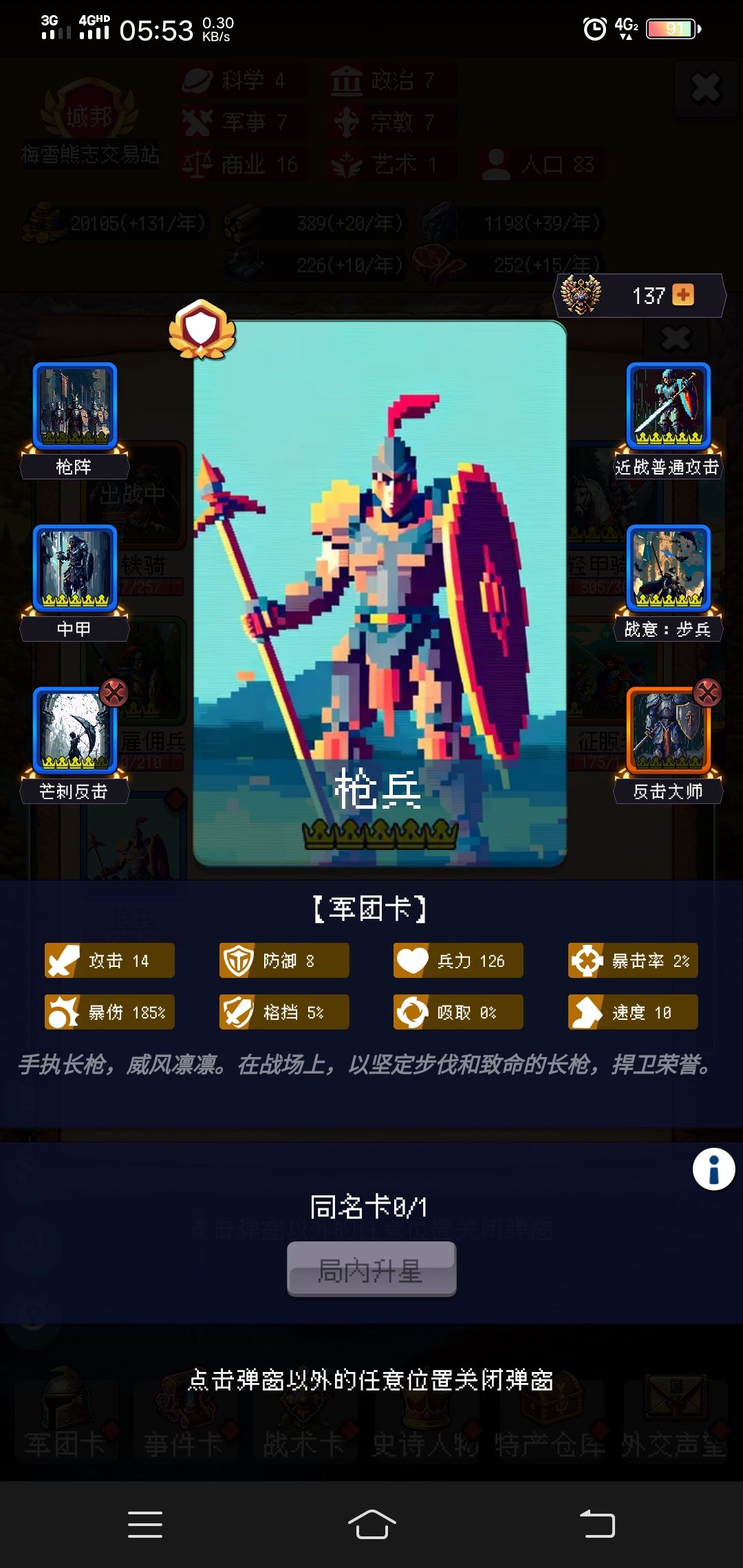 前期萌新只能玩步兵流或者步弓流所以史书里面步兵团招聘一定要点满,这样每十年就会给你一个枪兵,枪兵对于萌新还是相当不错的。其次你可以在军事中点与步兵一系列加成。前期萌新开荒的话,可以用枪兵和手术。手术可以给予玩家前期相对的回复。如图上↑↑↑