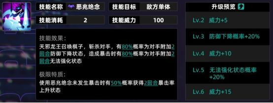 二技能单体伤害技能:破甲+禁强。可以100%降低对手防御,并且在堆满暴击的情况下为对手施加无法强化状态,主要用于pve挖矿,可以降低boss击杀难度,对于新手玩家而言可以降低开荒翻车率。