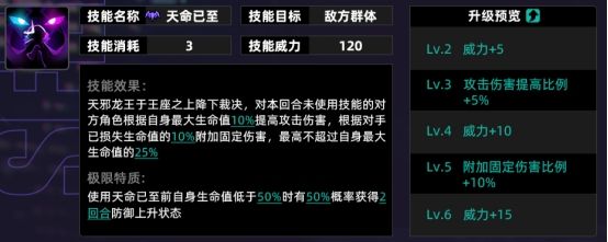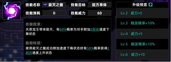 三技能输出技能,利用天邪龙王的高初始速度,开局即可打出不俗伤害,与哈莫雷特相同机制,可以多堆百分比生命属性,既可以提升天邪龙王生存能力,也可以提升输出能力,一举两得。