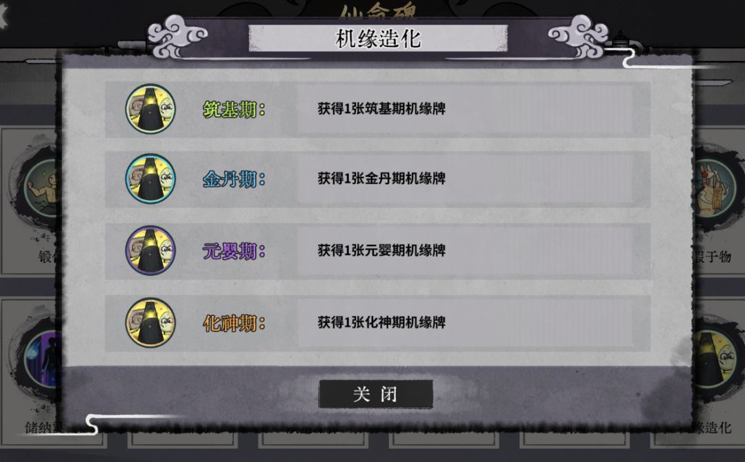 机缘分为法宝、灵宠、秘术。灵宠法宝为通用的,秘术和门派相关。机缘置换时,10%概率换到高一境界的卡,练气拿筑基;元婴拿化神;化神就有10%概率拿返虚了。