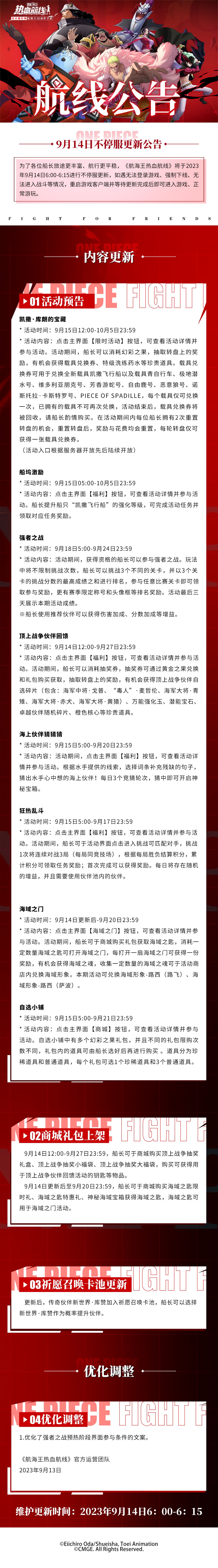 为了各位船长旅途更丰富、航行更平稳,《航海王热血航线》将于2023年9月14日6:00-6:15间进行不停服更新,如遇无法登录游戏、强制下线、无法进入战斗等情况,重启游戏客户端并等待更新完成后即可进入游戏、正常游玩。