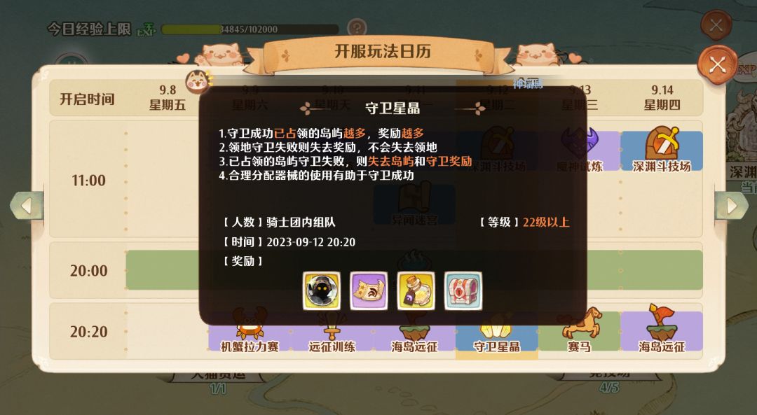 6、部分骑士团玩法也会奖励不受限经验,比如温泉、海岛远征、守卫星晶,但这些玩法都是晚上才开放,所以最后再考虑通过它们来补齐经验