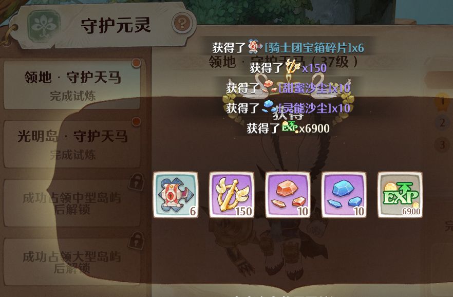 1、先到骑士团领地,到【守护元灵】处领取试炼奖励(跑一下路就能拿,最轻松获得受限经验的方式)