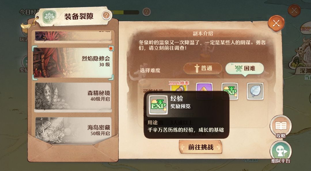 3、之后去打30级和20级的【装备裂隙】(记得选困难,现在对我们来说可以无压力通关了,3分钟左右打完一局,可以拿4波受限经验)