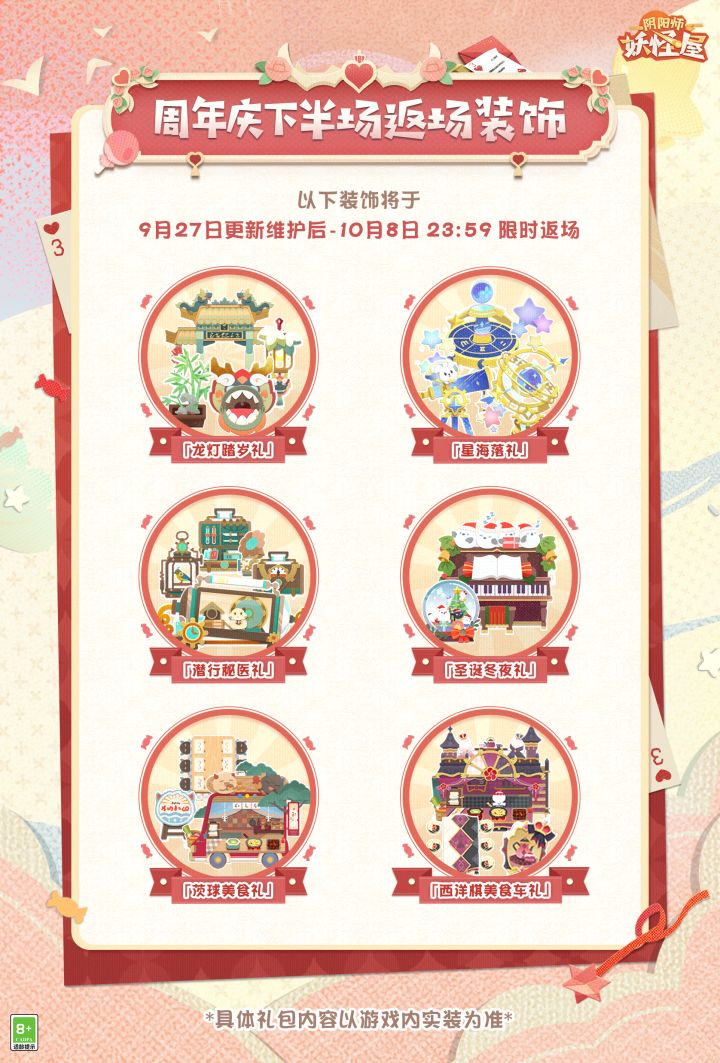 ·返场装饰:「龙灯踏岁礼」、「星海落礼」、「潜行秘医礼」 、「圣诞冬夜礼」、「茨球美食礼」、「西洋棋美食车礼」