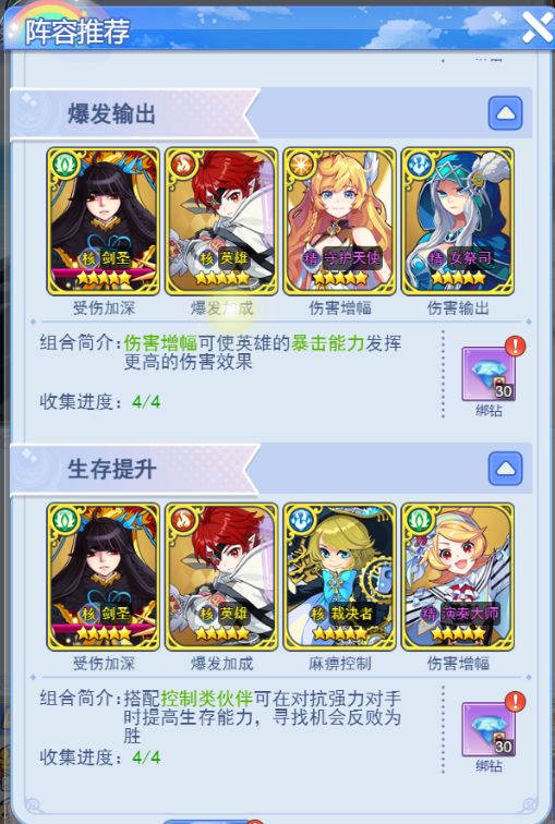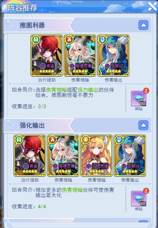我们伙伴数量庞大,官方也非常体贴的给大家设定了阵容搭配,大家可以按照阵容推荐进行不同游戏玩法的体验哦