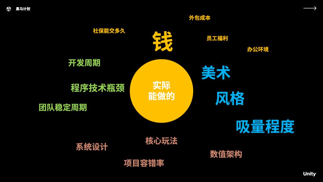 大家都知道钱最大,有一段时间为了维持团队研发同时做外包,很现实,这就是组建团队的依据。实际能做的这些东西里面分了几个级别,第一个是钱——要有米下锅。再就是门面——美术,别人会不会因为你的画面点进去很重要。然后是核心玩法、开发周期、程序技术瓶颈,团队稳定周期是社保能交多久,员工福利怎么样。