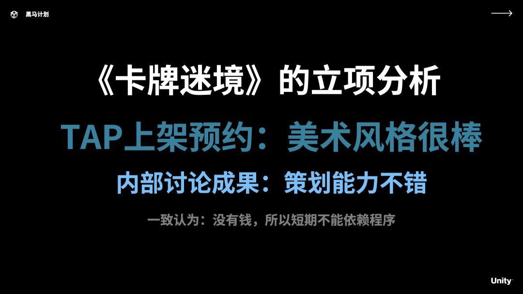 Unity 技术开放日上海站黑马训练营专场中,猫事多游戏工作室制作人李淳,以内容向卡牌手游《卡牌迷境》项目为例,探讨了小团队应该如何立项,并分享了《卡牌迷境》的开发历程。