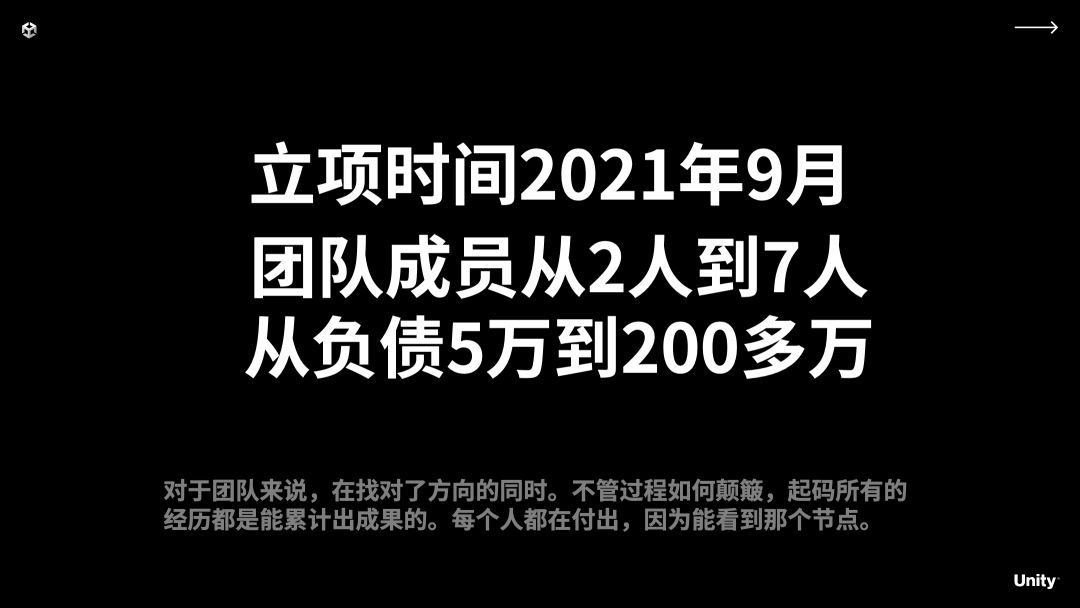 2021 年 9 月份立项,团队从 2 个人到 7 个人,从负债 5 万到负债 200 多万。我对这个团队和项目很有信心,对我个人来说 200 多万负债很大,但对项目来说很小。对我来说这个钱可以把项目做出来非常不容易,对团队来说,在找对了方向的同时不管过程怎么样,经历都能累计出成果,团队的每个人都可以看到节点。