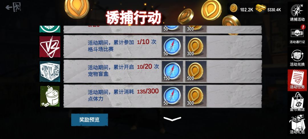 本期同样加入活动通行证,通过完成日任务和总任务,能获得通行证点数、地图币和指南针等物资,通行证任务相对简单,完成无忧。