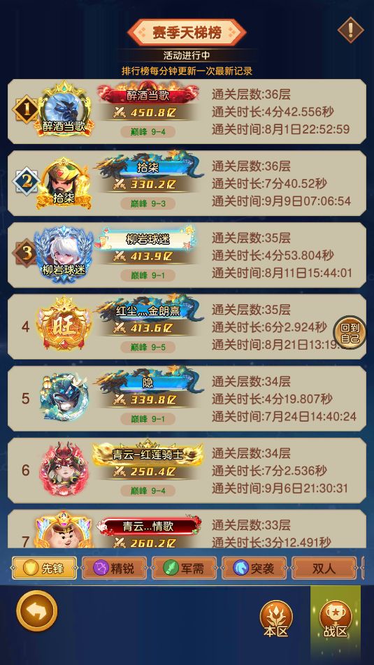 先锋-赛季天梯榜:【9-4 醉酒当歌】450亿战力 通关36层用时 4分42秒