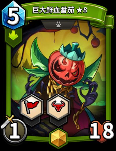 「巨大鲜血番茄」是一张绿色阵营黄金品质怪兽卡。虽然作为前排肉盾角色,在满级后的血量相较于「王子蘑菇」来说稍显逊色,且费用更高,但是其本身就具有近战能力,结合【狂怒】技能,在位于前排吸收更多伤害的同时也能够进一步提升输出能力。搭配【均衡】技能的怪兽,也许能有更大的发挥空间。