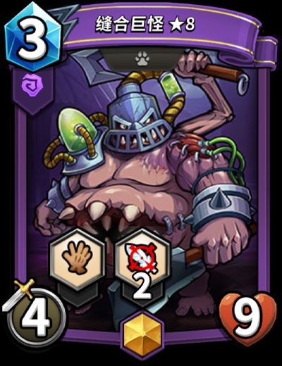 「缝合巨怪」是一张紫色阵营黄金品质怪兽卡。同时拥有【长手】和【防空】技能,在位于后排时,攻击敌方前排拥有【飞翔】技能的敌人更具有优势。
