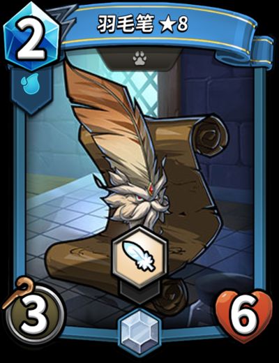「羽毛笔」是一张蓝色阵营白银品质怪兽卡。与同为白银品质的「仙灵法师」相比,费用更低,拥有的【飞翔】技能也提升了生存能力,但是相对的魔法伤害也降低了,这就要看牌友们使用时的取舍了。