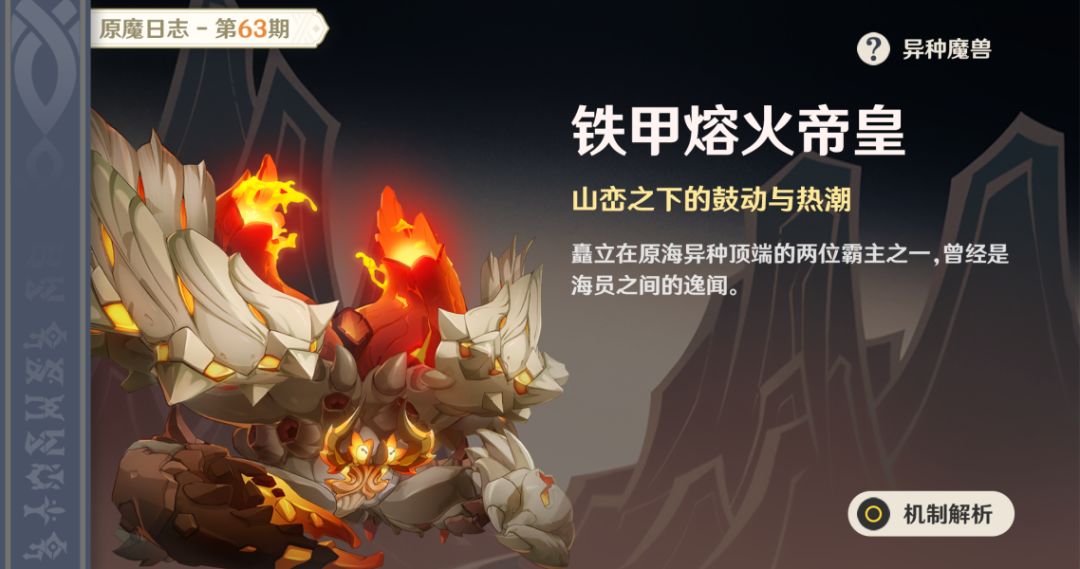 相对于蒙德的风龙、璃月和稻妻的龙蜥、须弥的蕈兽造成的骚乱,枫丹的原海异种则毫不逊色,大枫丹海的下方,盘踞着见证过枫丹第一次涨水期的巨大重甲蟹,人赋尊名——「铁甲熔火帝皇」。