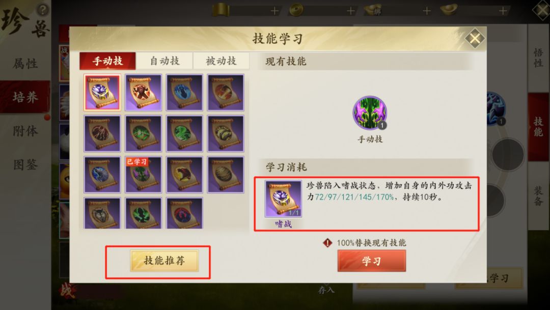 珍兽的技能搭配也需要考虑自身门派特性和珍兽的类型,在珍兽技能学习界面可查询技能推荐,也可以预览各个技能效果。