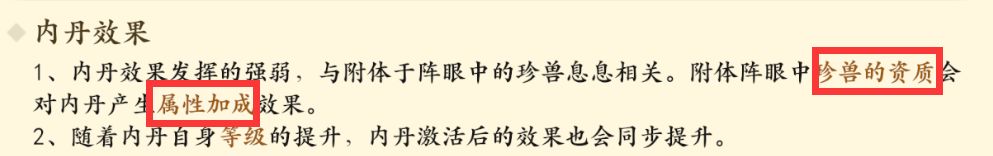 内丹效果受附体珍兽的资质影响,并且珍兽自身等级越高,内丹效果也越好。