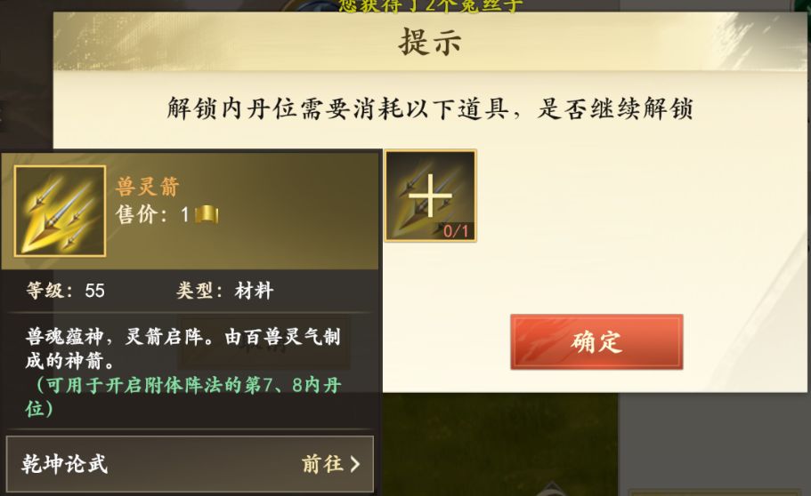 每个阵法的第7、8个内丹位需要通关乾坤论武获得并使用兽灵箭解锁后开启。