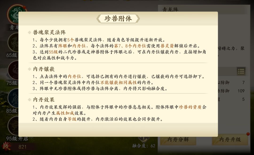 等级55级会解锁珍兽附体功能,并逐步解锁青龙(55级)、白虎(65级)、朱雀(75级)、玄武(85级)、麒麟(95级)五个阵法。
